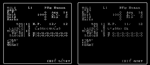 また、改変ではステータス表示画面を全体的に見直して、よりシリーズ作準拠の見た目にしたうえで、状態異状のテキストも本来の文章型のものに戻しています。